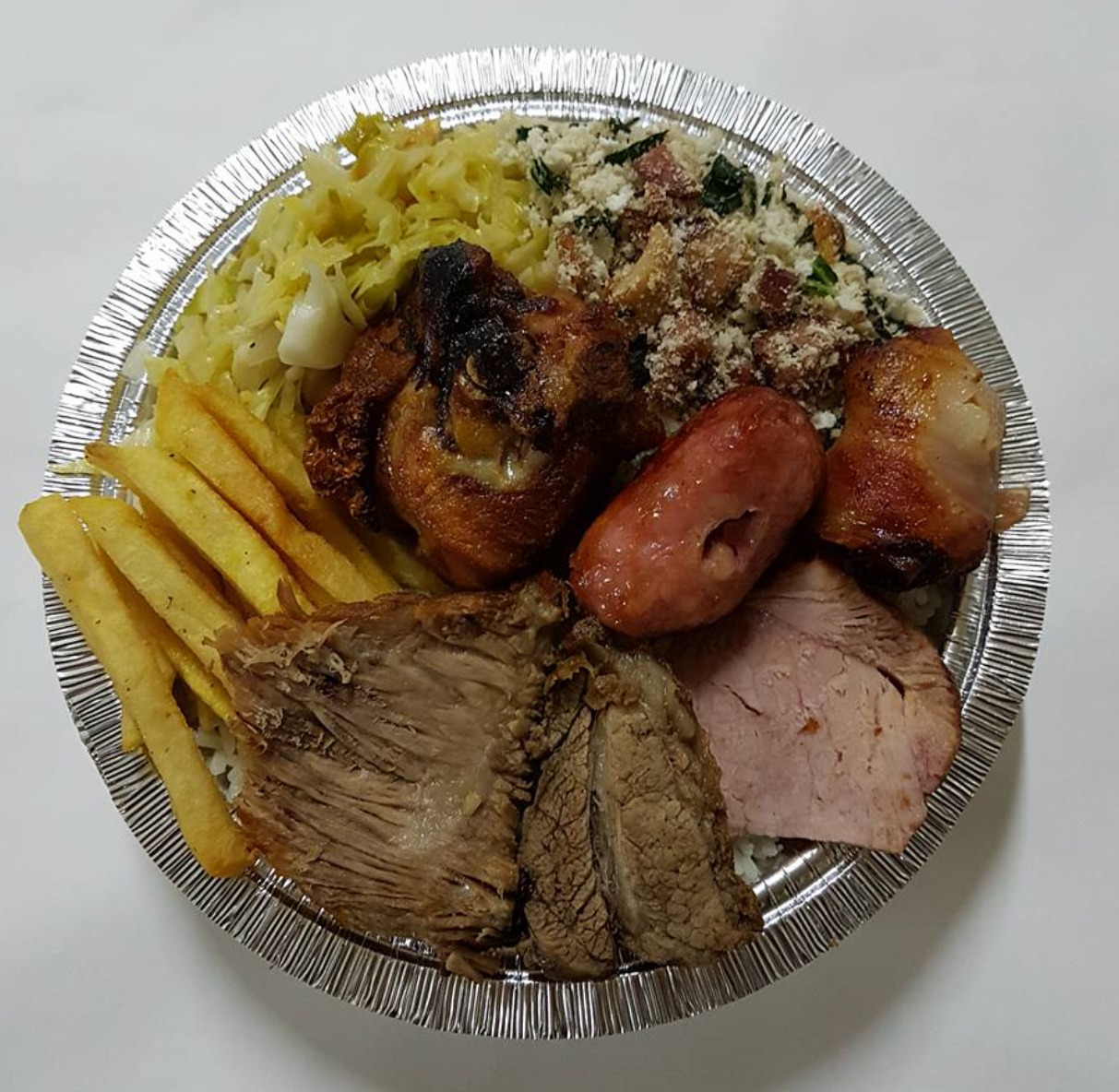 Porção composta por arroz branco acompanhado de repolho refogado, farofa temperada e batata frita crocante. Servido com seleção de carnes: carne bovina cozida e fatiada, pernil suíno assado, linguiça artesanal e frango assado com pele dourada. Uma refeição completa, saborosa e preparada com ingredientes frescos.