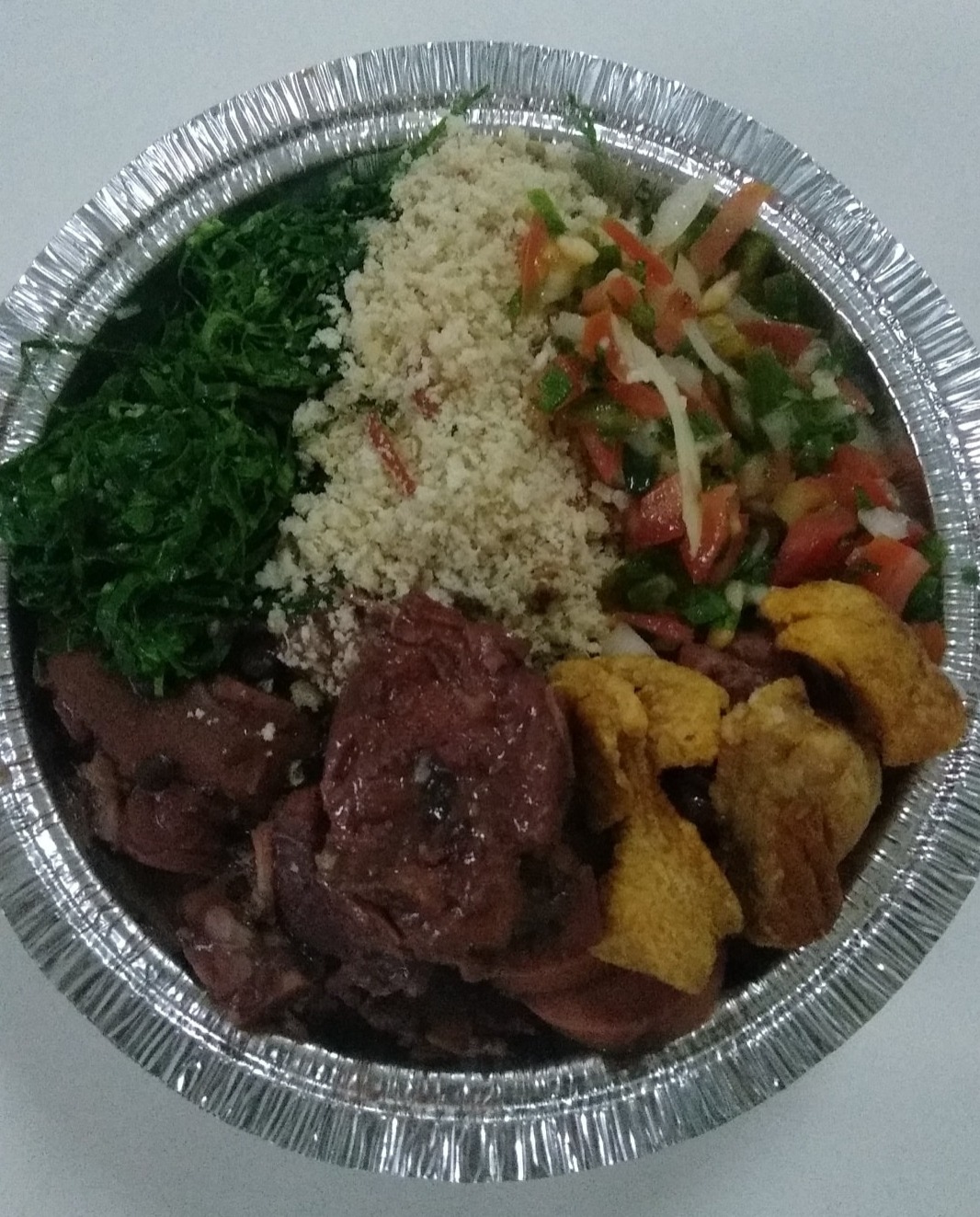 Feijoada tradicional composta por carnes selecionadas, acompanhada de couve refogada, farofa dourada e vinagrete fresco à base de tomate, cebola e pimentão. Finalizada com torresmo crocante para agregar textura e sabor. Uma opção robusta e clássica da culinária brasileira.